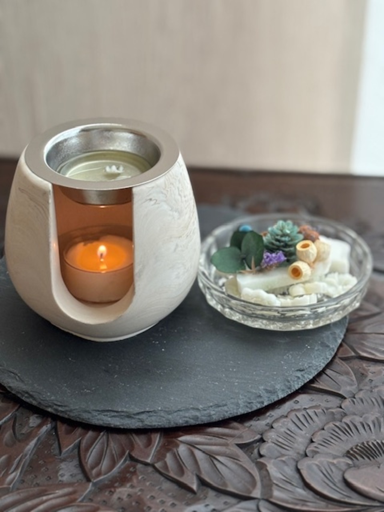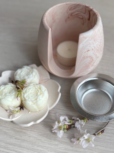 ジェスモナイトで制作された大人可愛い桜色のワックスウォーマー。トレイにワックスを置きティーライトキャンドルに火を灯すとワックスが緩やかに溶け始め天然精油がゆっくりと揮発し香りが広がります。ワックスは天然精油(エッセンシャルオイル)と自然由来のソイワックス(大豆)のみを使用。人工香料にくらべ天然精油の香りは主張が控えめですがその香りは自然です。穏やかに深く香りが空間に広がります。