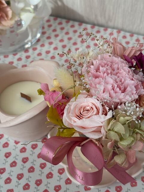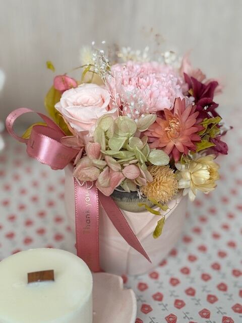 淡いピンク、くすみ色のピンク、アクセントのワインカラー、少しずつ違うピンクのグラデーションが甘く大人可愛いお花のアレンジメントです。バラやカーネーション、アジサイなど色々な種類のお花を贅沢に配置しておりますので360度どこからでも目を楽しませてくれます。使用しているお花はプリザーブド&ドライフラワー。生花とは違いお手入れ要らずで長い期間飾れることも魅力です。母の日をイメージしてふんわりと華やかに優しい雰囲気が溢れるアレンジメントです。心に残る贈り物として母の日はもちろん、お祝い、お礼などにもおすすめです。