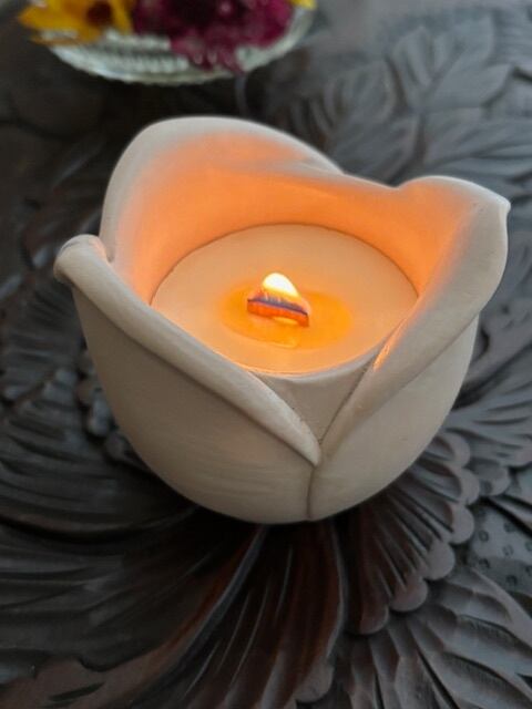 バラの形のジェスモナイトで制作した花器は花入れとして飾ったり、ウッドウィックキャンドルを入れ火を灯せばパチ、ポッポ、ジリッという木の爆ぜる微かな音をお楽しみいただけます。キャンドルは天然精油(エッセンシャルオイル)と自然由来のソイワックス(大豆)のみを使用したキャンドルです。人工香料にくらべ天然精油の香りは主張が控えめですがその香りは自然です。穏やかに深く香りが空間に広がります。