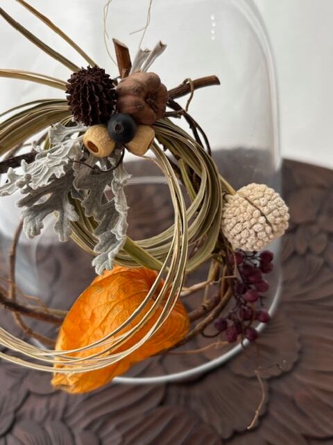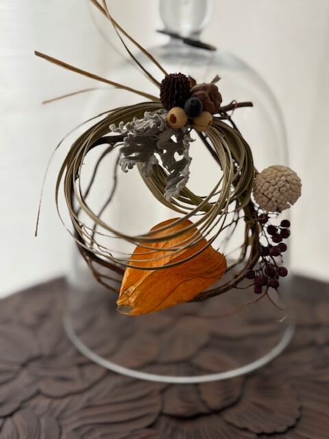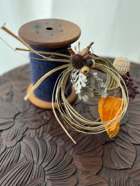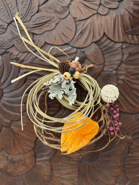 雲竜柳(ウンリュウヤナギ)を夏の間乾燥させた手作りのリースに自然素材の葉や実を飾った素朴なリースです。草木が深く豊かに色づく静かな秋をイメージし雲竜柳の自然な形が立体的で流動感のあるデザインになりました。控えめな手のひらサイズだから場所を選ばず飾れます。