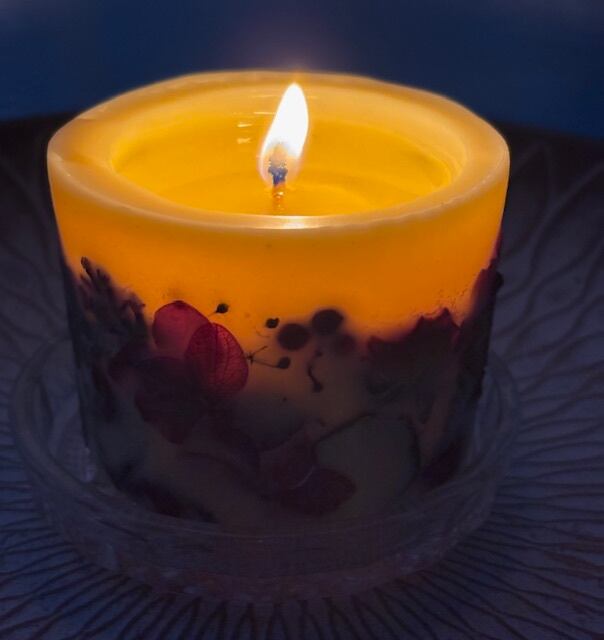 こっくりとした深みのある色のお花、実、葉っぱアレンジした落ち着きのあるデザインに、香りはジャスミンとシトラスやスパイスをブレンドしたボタニカルキャンドルです。大豆成分のソイワックスと植物から香り成分を抽出した精油(エッセンシャルオイル)のみを使用した100%天然素材のキャンドルです。外側と内側を別々に制作し2重構造で一つのキャンドルを作っているので外側のキャンドルの花材が燃えにくい構造になっております。毎回灯す時間を2時間を目途に使用する事でキャンドルの内側部分だけが溶け沈み、徐々に窪みが深くなりランタンの様な形になります。窪みが深まると内側のキャンドルライトでほんわりと外側のお花が浮かび上りとても綺麗です。優しい香りの天然精油がソイワックスの溶けゆく時間によりゆっくりと揮発します。精油は合成香料とは違い天然香料です。香りはフワリと優しく香ります。キャンドルと呼吸するように静かで落ち着く時間をお過ごしください。