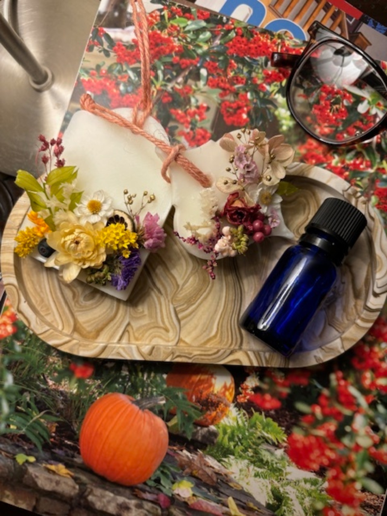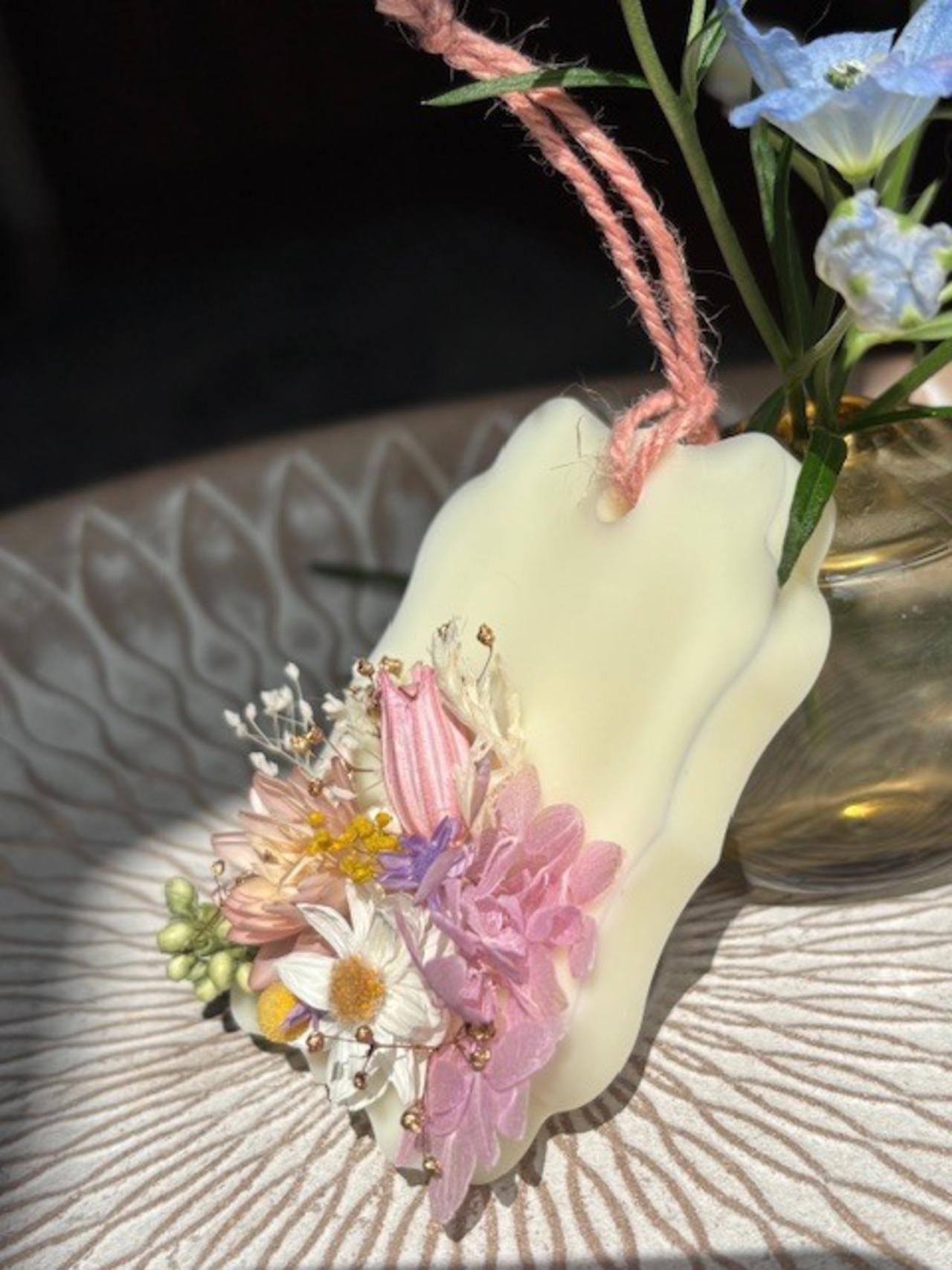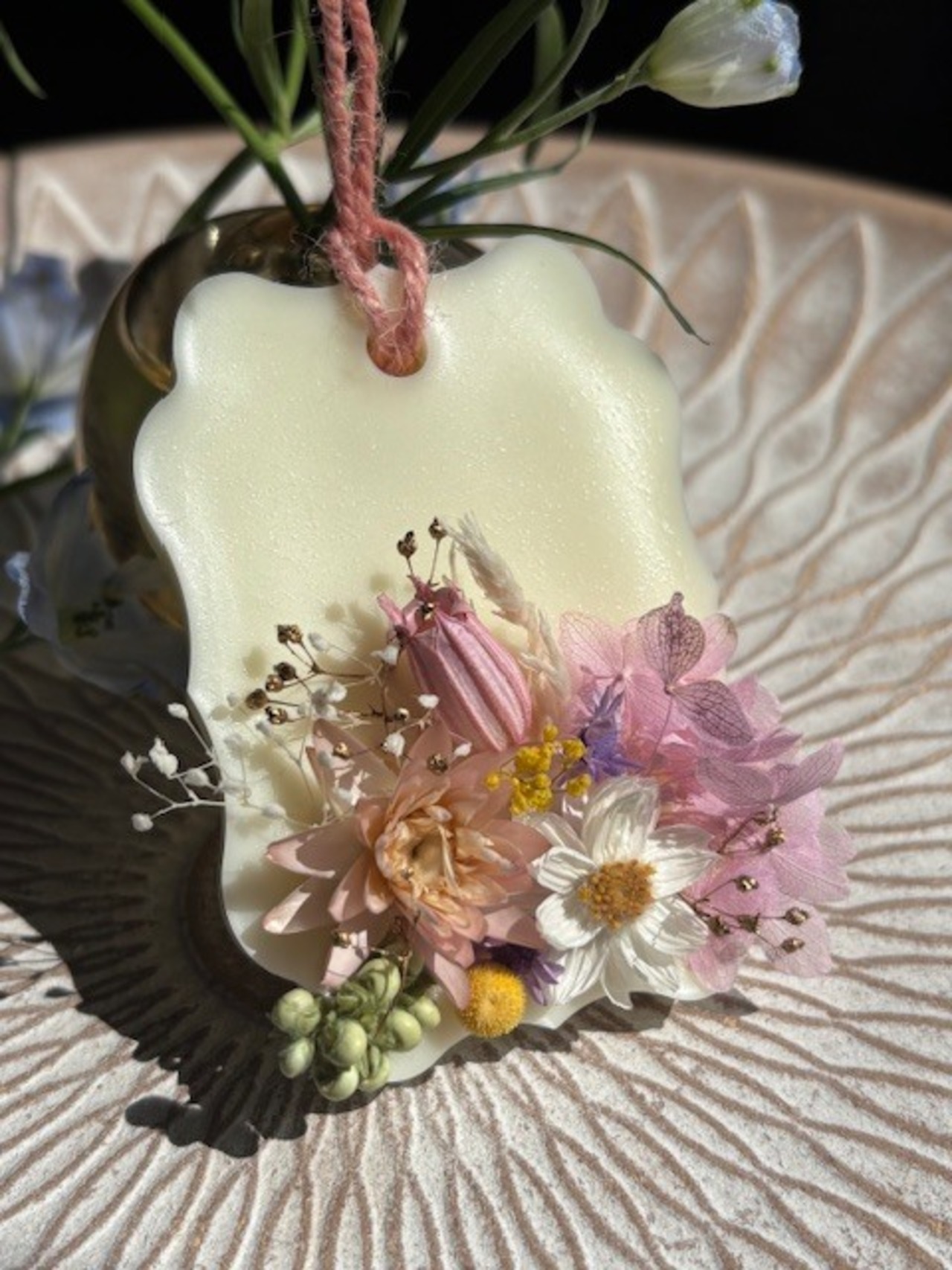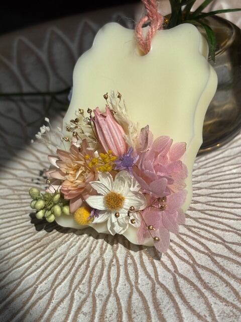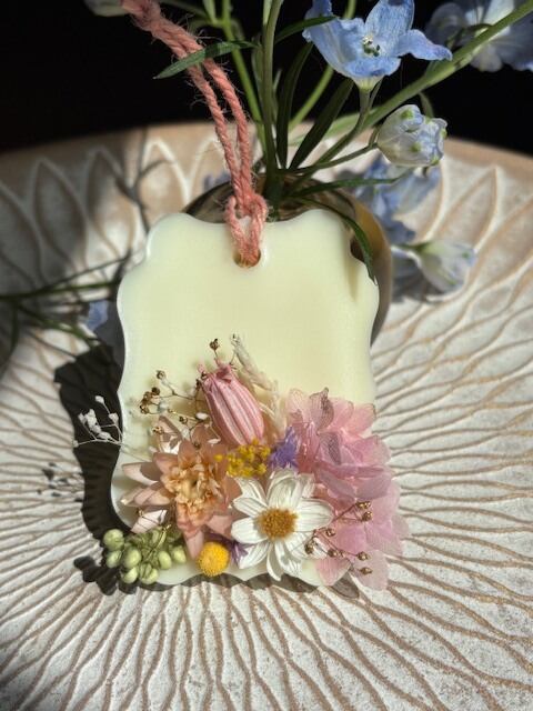 精油の香りが高いままお届けしたく、ご注文を頂いてからの制作になります。画像に近い花材とデザインでお作り致しますが、手作りのため個体差が出てしまう事をご了承願います。