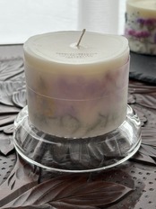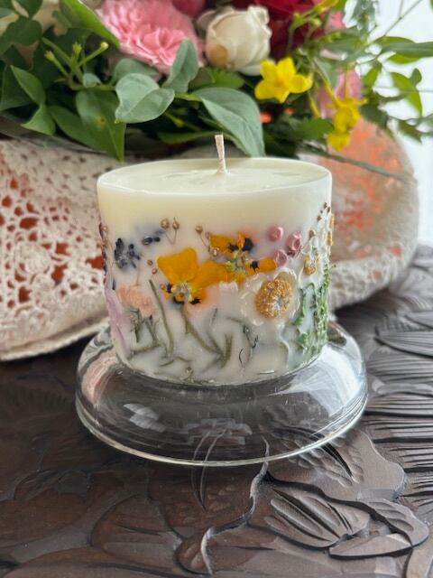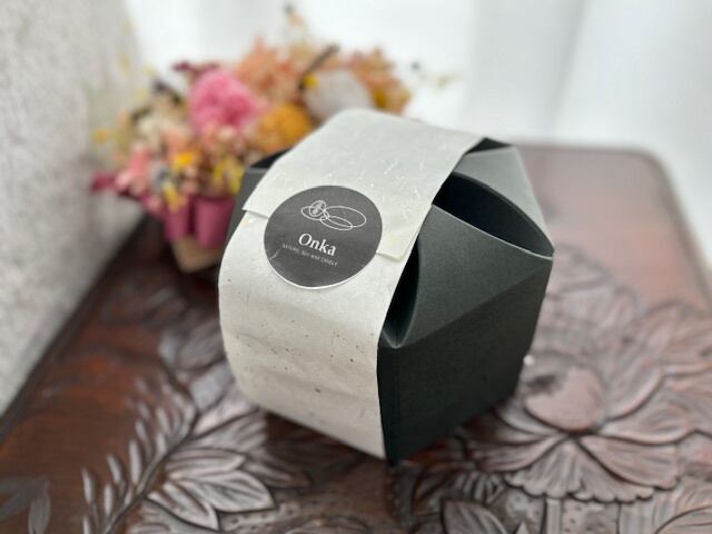 色とりどりの乾燥させたお花、実、葉っぱ、果実が沢山詰まったボタニカルキャンドルです。外側と内側を別々に制作し2重構造で一つのキャンドルを作っているので外側のキャンドルの花材が燃えにくい構造になっております。毎回灯す時間を2時間を目途に使用する事でキャンドルの内側部分だけが溶け沈み、徐々に窪みが深くなりランタンの様な形になります。窪みが深まると内側のキャンドルライトでほんわりと外側のお花が浮かび上りとても綺麗です。優しい香りの天然精油がソイワックスの溶けゆく時間によりゆっくりと揮発します。精油の香りは主張が控えめ。穏やかに深く香りが広がります。