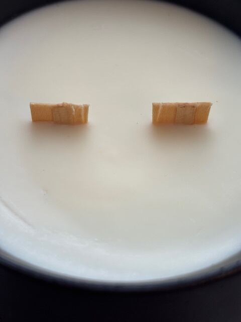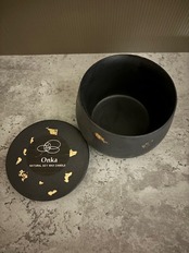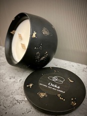 掌にしっくりと収まるのは一つずつ丁寧に手作りしたジェスモナイトの容器。100%ソイワックスとエッセンシャルオイルだけを使用しました。木芯からはジリパチ、ポツポツ、ポッポッ、まるで火が生きている様な音もお楽しみ頂けます。OnKa独自でブレンドしたエッセンシャルオイルはトップからミドルそしてベースへと香りが変化しソイワックスの溶けゆく時間によりゆっくりと精油の香りが広がり深まります。