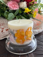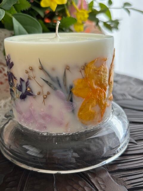 色とりどりの乾燥させたお花、実、葉っぱ、果実が沢山詰まったボタニカルキャンドルです。外側と内側を別々に制作し2重構造で一つのキャンドルを作っているので外側のキャンドルの花材が燃えにくい構造になっております。毎回灯す時間を2時間を目途に使用する事でキャンドルの内側部分だけが溶け沈み、徐々に窪みが深くなりランタンの様な形になります。窪みが深まると内側のキャンドルライトでほんわりと外側のお花が浮かび上りとても綺麗です。優しい香りの天然精油がソイワックスの溶けゆく時間によりゆっくりと揮発します。精油の香りは主張が控えめ。穏やかに深く香りが広がります。