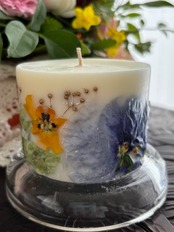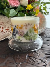 色とりどりの乾燥させたお花、実、葉っぱ、果実が沢山詰まったボタニカルキャンドルです。外側と内側を別々に制作し2重構造で一つのキャンドルを作っているので外側のキャンドルの花材が燃えにくい構造になっております。毎回灯す時間を2時間を目途に使用する事でキャンドルの内側部分だけが溶け沈み、徐々に窪みが深くなりランタンの様な形になります。窪みが深まると内側のキャンドルライトでほんわりと外側のお花が浮かび上りとても綺麗です。優しい香りの天然精油がソイワックスの溶けゆく時間によりゆっくりと揮発します。精油の香りは主張が控えめ。穏やかに深く香りが広がります。