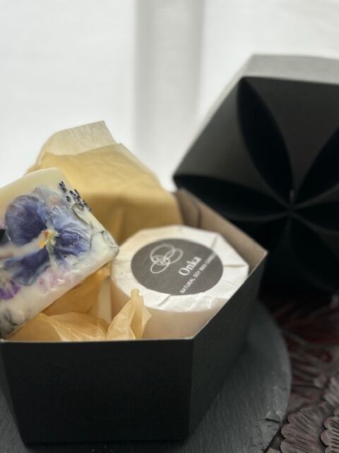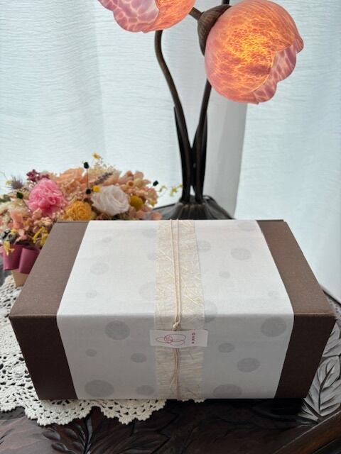 ボタニカルキャンドル2個をギフトとしてご注文の方は1つ目のペーパーのお色をお選びください。2個目は白の雨声か灯のどちらかをお包みいたします。ギフト箱に巻く帯は絵柄ではなく通常包装の帯(画像9)となります。