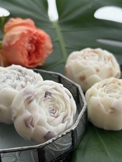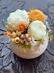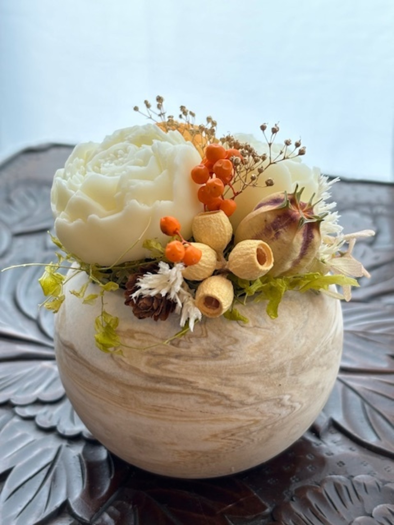 ソイワックスのお花にバラの花びらを香り付けした小さなポプリが入れられます(画像8&9)くすみかかった赤と黄色のバラのドライフラワーがソイワックスのコックリとした白と混じり合いアクセントになります。ポプリなし、赤のポプリ、黄色のポプリかお選びください。