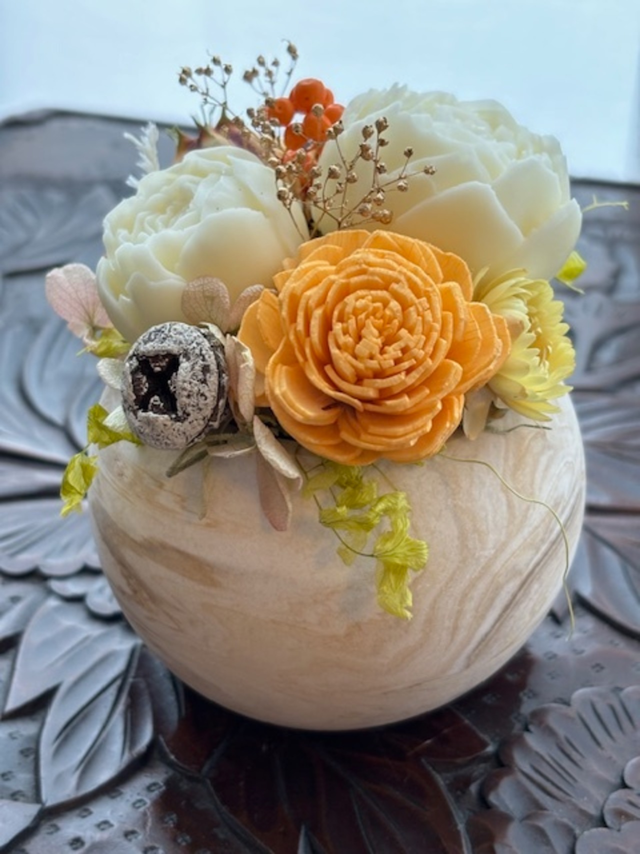 コロンとした大人可愛い手作りのマーブル模様の花器。ソイワックスと精油(エッセンシャルオイル)のみを使用し100%天然素材のアロマワックスで白い華憐なお花が咲きました。アロマワックスは精油を贅沢に12%配合。色とりどりの乾燥させたお花、実、葉っぱで華やかにデコレーションをし精油がふんわりと優しく香ります。