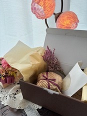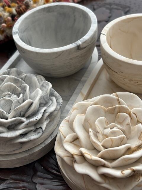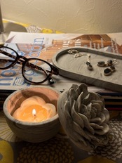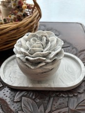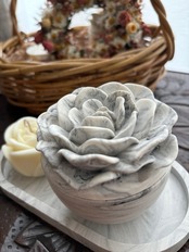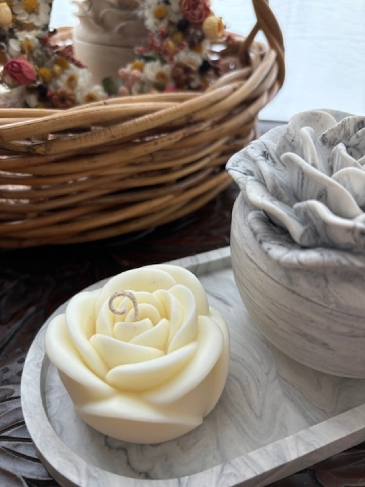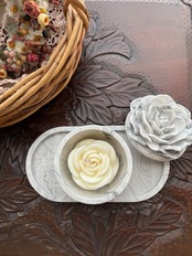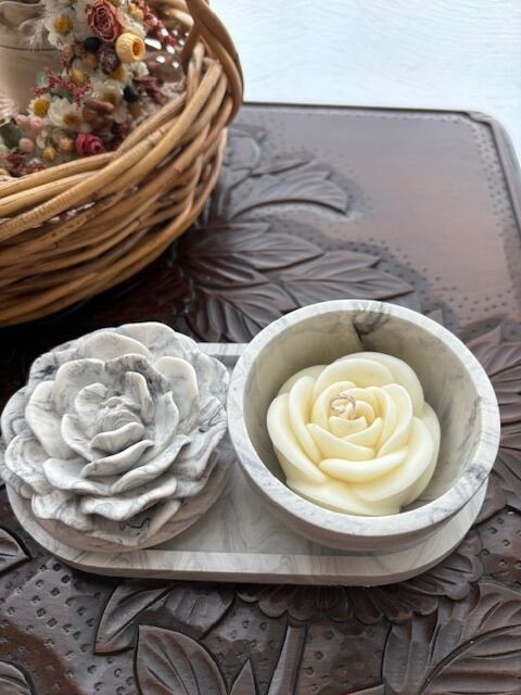 ジェスモナイトで制作したマーブル模様の容器に可愛いローズの蓋が付きました。 容器&キャンドル&トレイの3点セットです。バラの形のキャンドルはソイワックスとエッセンシャルオイル(精油)のみを使用した100%天然素材。使い方はいろいろ。キャンドルとして使用する前に優しく香るソイワックスフラワーをちょこんと飾ったり、容器は小物入れとして、最後に器にキャンドルをポンと入れ火を灯し炎のゆらぎでリラックスしたり、トレイは眼鏡やジュエリー置きとしてご使用いただけます。キャンドルは必ず容器の中で火を灯しお使いください。ロウが流れ出し危険です。容器はロウ染みを防ぐ為に水性コーティングを塗布しております。ご使用後の容器でロウが取りづらい場合はドライヤー等でロウを溶かし座金を外し紙などでロウを拭き取ってください。小物入れや詰め替えのキャンドルを入れて再利用可能です。