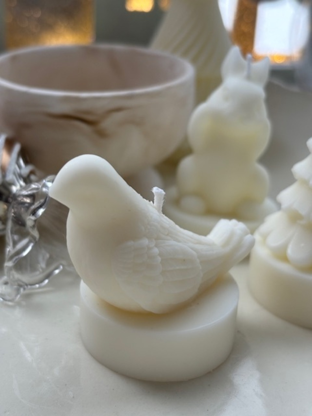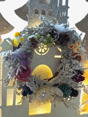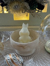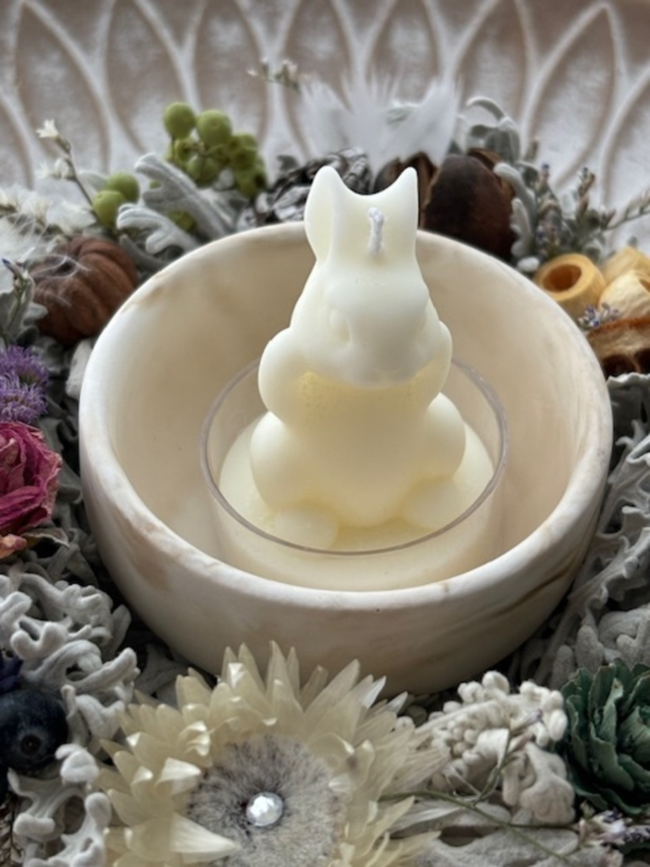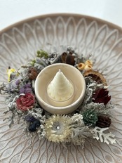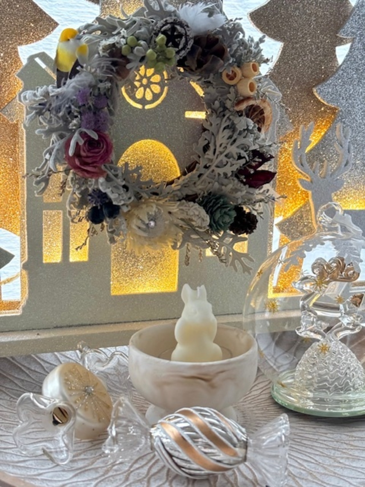 冬の森の朝をイメージした作品です。リースには小さな小鳥が見守り、マーブル模様のジェスモナイトの器にはウサギさん、ハトさん、クリスマスツリーが飾れます。リースはドライフラワーや木の実、OnKaの庭からやってきたお花や葉っぱをアレンジしました。平置きと壁掛けで飾れます。ジェスモナイトのキャンドルホルダーはロウ染みを防ぐコーティングをしておりますので、火を灯しキャンドルとしても、また使用後はロウを取り除き入れ替え用キャンドルで違う香りを楽しんだり小物入れとしてもご使用できます。キャンドルはソイワックスとエッセンシャルオイル(精油)のみを使用した100%天然素材。ウサギ/ツリー/ハトからお選びいただけます。