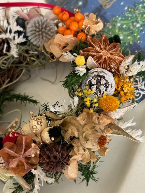 こちらのリースはご注文をお受けしてからの制作になります。天然の植物を扱い手作りで制作しております。画像と近い花材の配置や花材を使用いたしますが若干の違いがある事は作品の個性としてご了承ください。