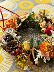 お家のどこかにちょこんと飾れるかわいいサイズのリース。色とりどりの乾燥させたお花、実、葉っぱ、果実がギュッと詰まってとても賑やか。控えめな手のひらサイズだから場所を選ばず飾れて一瞬で楽しく華やかな雰囲気に。プレゼントにも人気です。